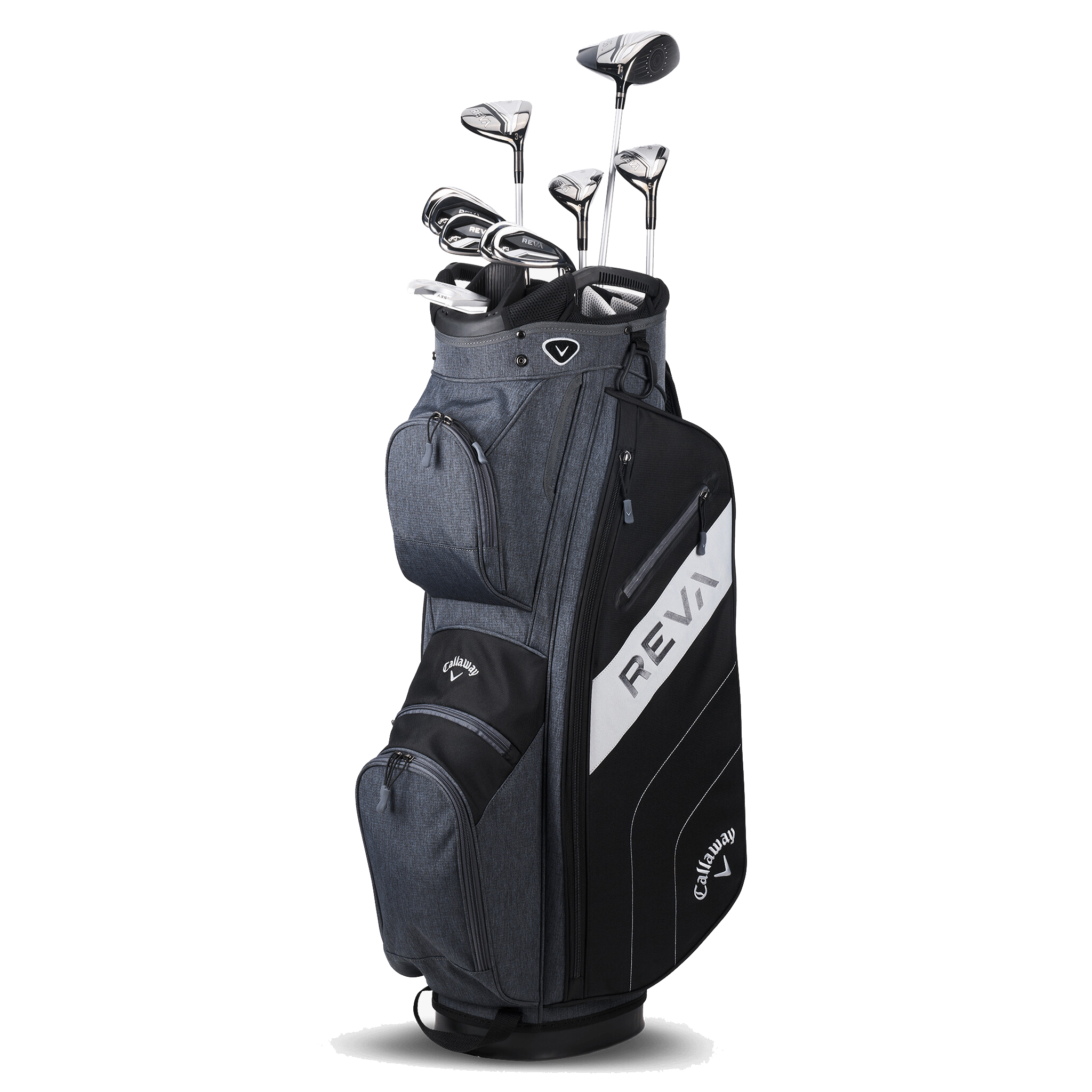 Dieses 8-teilige REVA-Set enthält einen Driver mit Callaways Verbundkronentechnologie, 5-Holz, 6-Hybride, Eisen 7 und 9, Sand-Wedge, Putter, Cart Bag und (4) Premium-Schlägerhauben.
