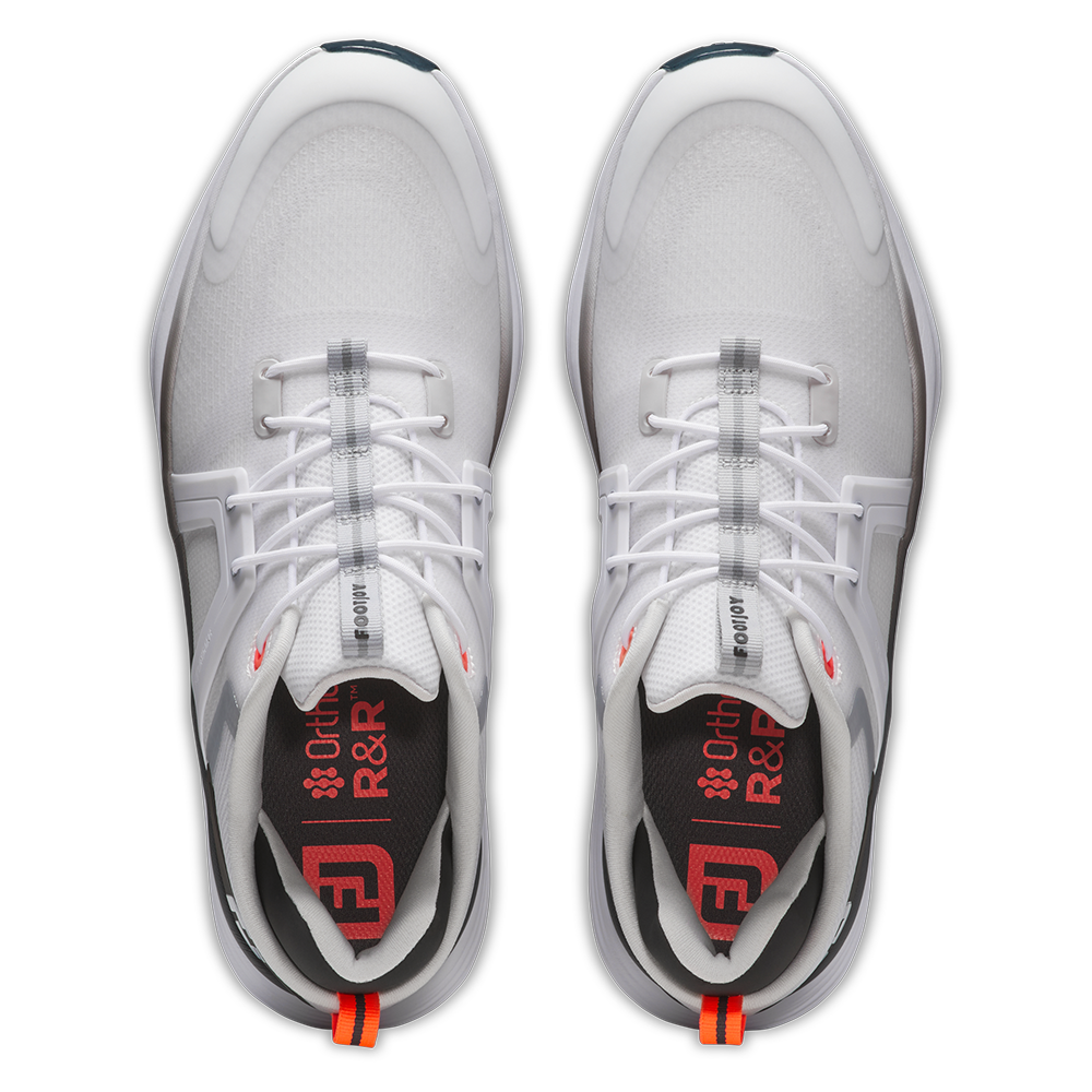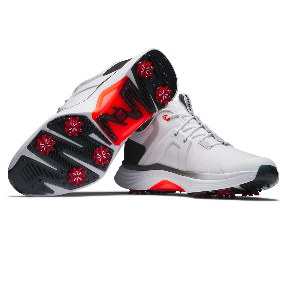 Die HyperFlex Golfschuhe für Herren sind speziell auf den modernen Golfsportler abgestimmt. Hyper angetrieben mit einem speziell geformten und integrierten thermoplastischen Seitenwickel und Sattel. Dieses innovative Design umschließt den Fuß und bietet die perfekte Balance aus Kontrolle und Stabilität während Deines Schwungs.