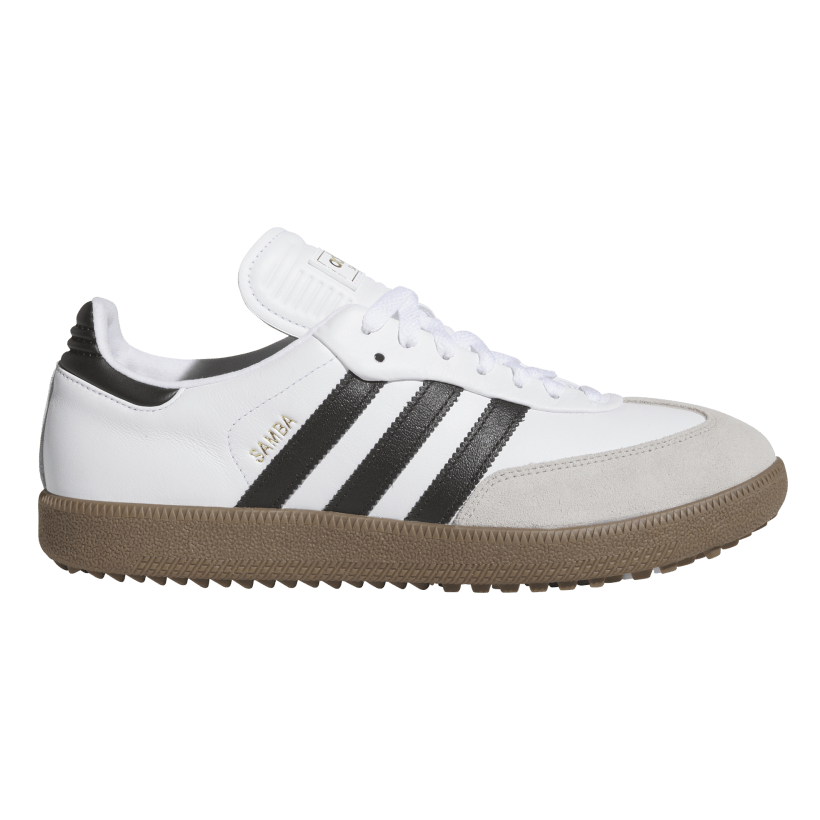 Bringen Sie mit diesen adidas Samba Golf-Sneakers eine Portion originellen Stil in Ihre nächste Runde. Sie behalten den traditionellen Look des Originalmodells bei, haben ein Obermaterial aus Leder mit Wildlederdetails und verfügen über die ikonische gepunktete Zehenpartie. Sie verfügen über eine dämpfende Zwischensohle und eine Gummilaufsohle, die Ihnen auf dem Platz zuverlässigen Halt bietet, sodass Sie alle 18 Löcher bequem spielen und dann zum Club gehen können.